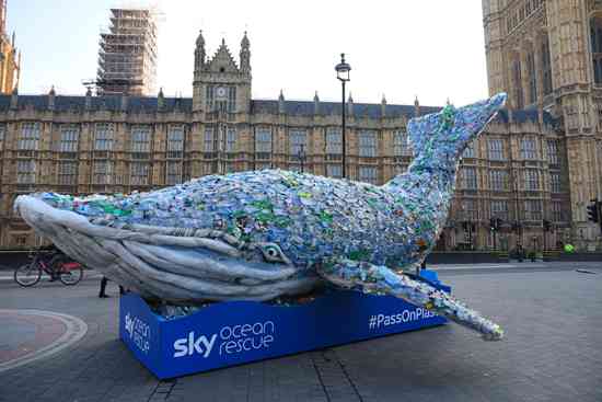 英國(guó)會(huì)大廈前現(xiàn)巨型塑料鯨魚(yú),呼吁減少海洋垃圾。視覺(jué)中國(guó)供圖