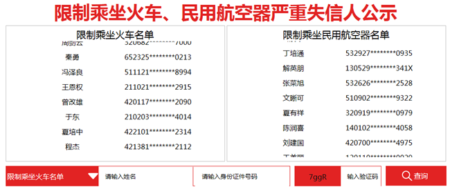5月1日,國(guó)家發(fā)改委、鐵路總公司、民航局等部門聯(lián)合發(fā)布的《關(guān)于在一定期限內(nèi)適當(dāng)限制特定嚴(yán)重失信人乘坐火車 推動(dòng)社會(huì)信用體系建設(shè)的意見(jiàn)》和《關(guān)于在一定期限內(nèi)適當(dāng)限制特定嚴(yán)重失信人乘坐民用航空器 推動(dòng)社會(huì)信用體系建設(shè)的意見(jiàn)》正式實(shí)施。與此同時(shí),中國(guó)鐵路總公司發(fā)布的《關(guān)于限制鐵路旅客運(yùn)輸領(lǐng)域嚴(yán)重失信人購(gòu)買車票的管理辦法》同步實(shí)施。