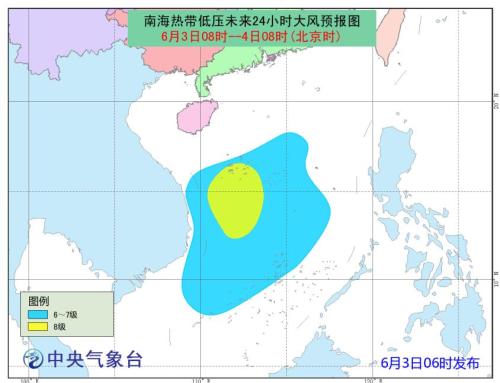 中央氣象臺(tái)3日06時(shí)繼續(xù)發(fā)布熱帶低壓預(yù)報(bào):南海熱帶低壓的中心今天5點(diǎn)鐘位于我國(guó)西沙永興島偏南方大約410公里的南海南部海面上(北緯13.2度、東經(jīng)111.9度),中心附近最大風(fēng)力有7級(jí)(15米/秒),中心最低氣壓為1002百帕。