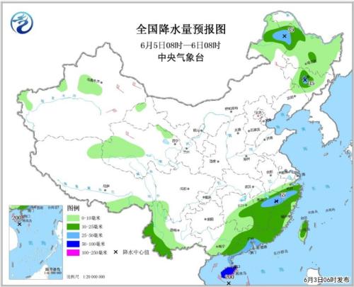 全國(guó)降水量預(yù)報(bào)圖(6月5日08時(shí)-6月6日08時(shí))