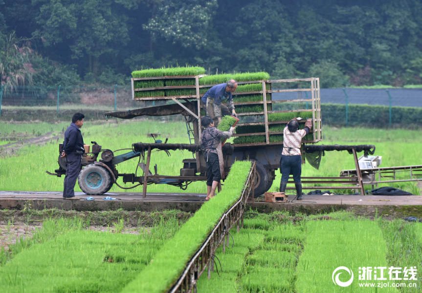 武義縣一育秧工廠員工忙著為訂單農(nóng)戶起運單季稻秧苗。