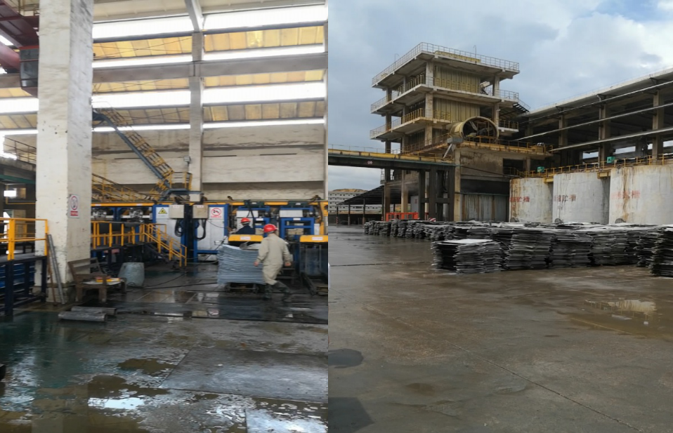 圖3 電解車間高濃度電解廢水灑落地面(左圖),違規(guī)將沾染高濃度重金屬?gòu)U水的電解板露天堆放(右圖)