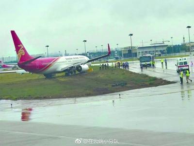 有網友將現場視頻發(fā)布在網絡上,視頻中顯示,一架深圳航空的飛機停在機場跑道旁的草坪上,草坪上有明顯的飛機輪胎印記,多輛救援車輛及機場大巴??吭陲w機附近。