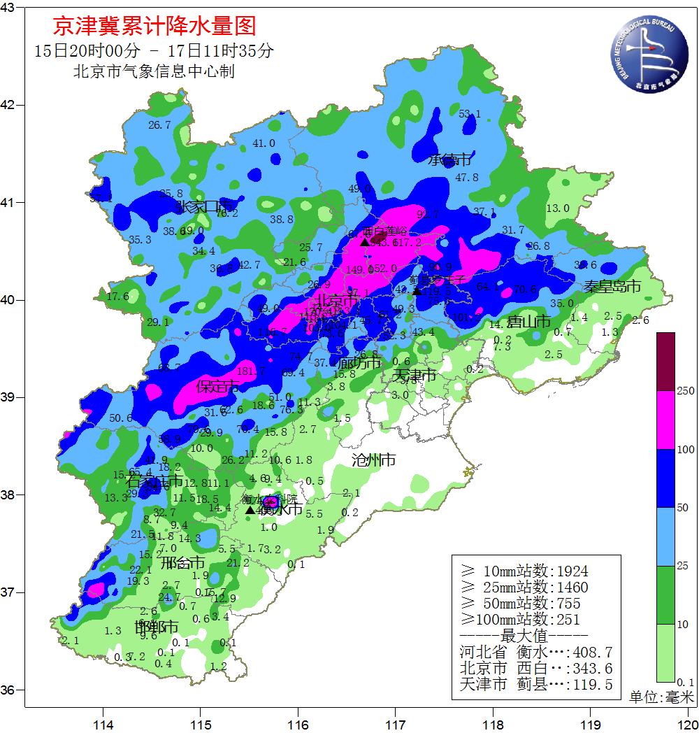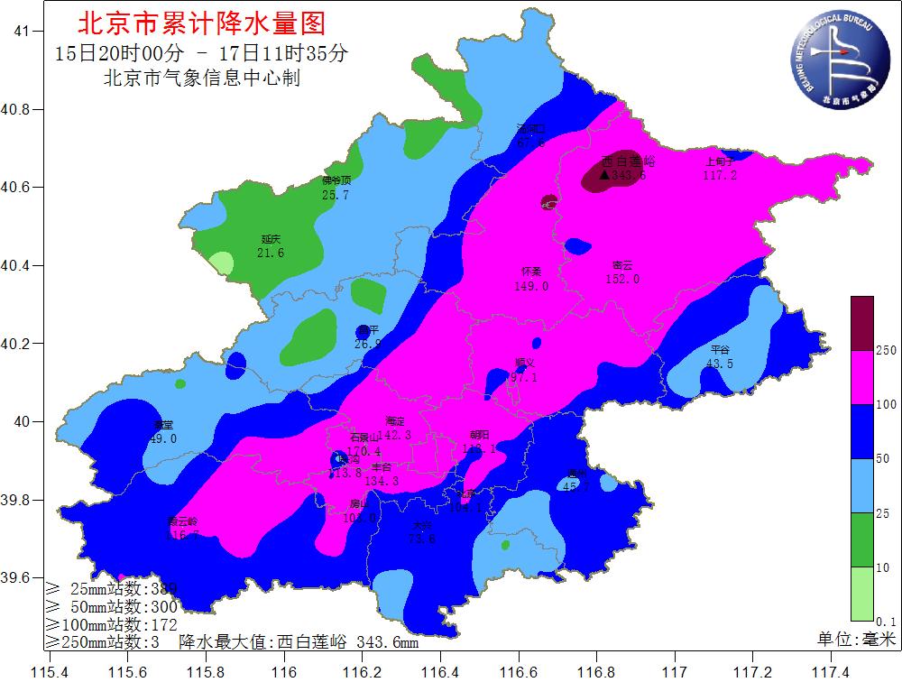 根據(jù)氣象觀測,15日20時(shí)至17日8時(shí),北京市平均降水量達(dá)77.7毫米,城區(qū)平均100.9毫米,全市453個(gè)氣象觀測站中有121個(gè)超過100毫米、12個(gè)超過200毫米。其中,密云有2個(gè)測站超過300毫米,分別是西白蓮峪達(dá)(336毫米)和捧河巖村(302毫米)。