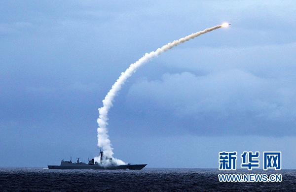 ??谂炘趯?shí)彈演習(xí)中發(fā)射艦空導(dǎo)彈攔截來襲目標(biāo)(2010年7月26日攝)。 新華社發(fā)