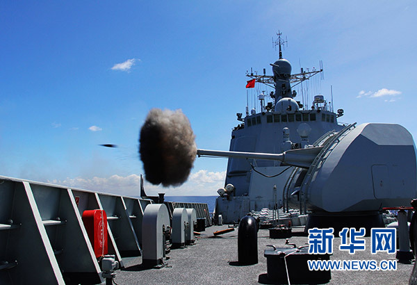 在多國聯(lián)演任務(wù)中,海口艦進(jìn)行主炮射擊(2014年6月19日攝)。 新華社發(fā)(于林 攝)