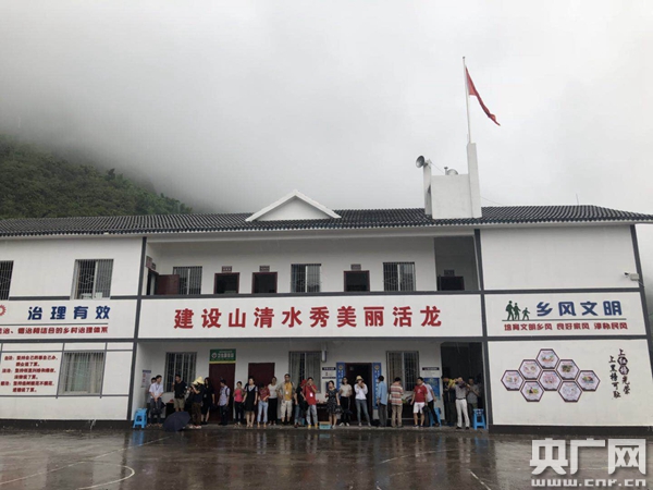 云陽(yáng)縣盤龍街道活龍社區(qū)居民委員會(huì)整潔的辦公場(chǎng)地,由于下雨,當(dāng)?shù)卮迕裨谶@里向記者介紹他們的綠色發(fā)展新路子。(管昕 攝)