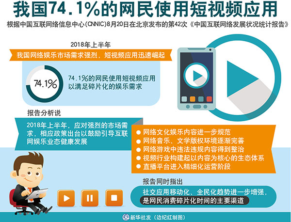新華社北京8月20日電(記者施雨岑、王思北)根據(jù)中國互聯(lián)網(wǎng)絡(luò)信息中心(CNNIC)20日在京發(fā)布的第42次《中國互聯(lián)網(wǎng)絡(luò)發(fā)展?fàn)顩r統(tǒng)計報告》,2018年上半年,我國網(wǎng)絡(luò)娛樂市場需求強烈,短視頻應(yīng)用迅速崛起,74.1%的網(wǎng)民使用短視頻應(yīng)用,以滿足碎片化的娛樂需求。