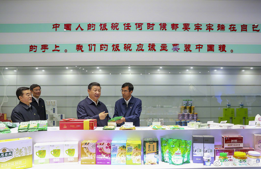 25日下午,首個(gè)“中國(guó)農(nóng)民豐收節(jié)”剛過(guò),習(xí)近平就深入三江平原腹地黑龍江農(nóng)墾建三江管理局,考察糧食生產(chǎn)和收獲情況。他邊聽(tīng)介紹,邊向農(nóng)場(chǎng)負(fù)責(zé)人詢問(wèn)今年收成如何、有沒(méi)有病蟲害、能否做到連年豐收,并強(qiáng)調(diào)中國(guó)人的飯碗任何時(shí)候都要牢牢端在自己的手上。在北大荒精準(zhǔn)農(nóng)業(yè)農(nóng)機(jī)中心一樓大廳,當(dāng)?shù)爻霎a(chǎn)的米油豆奶等各類農(nóng)產(chǎn)品擺滿展臺(tái)。習(xí)近平走近前去,雙手捧起一碗大米,意味深長(zhǎng)地說(shuō):“中國(guó)糧食,中國(guó)飯碗?!保ㄎ淖郑簭垥运?攝影:謝環(huán)馳)