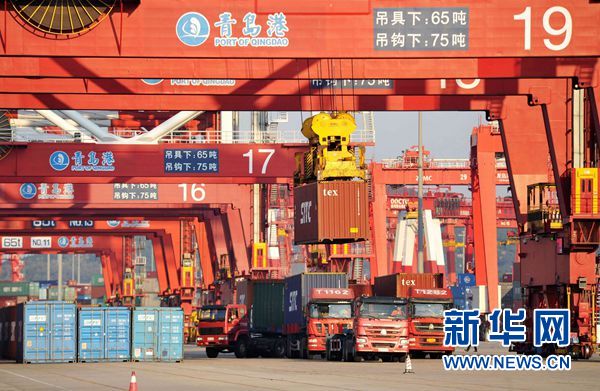 10月12日,車輛在山東青島港外貿(mào)集裝箱碼頭裝運(yùn)集裝箱。 新華社發(fā)(俞方平 攝)