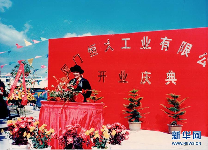 上世紀90年代初,黃紫玉在廈門的公司成立時站在紅色背景板前講話(受訪者供圖)。 新華社發(fā)