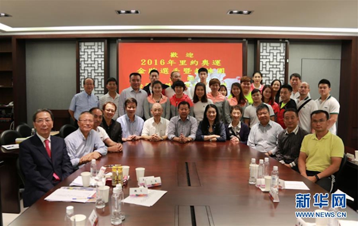 2016年,里約奧運會大陸金牌選手和教練交流團到“中華兩岸經貿投資文化教育協(xié)會”座談交流時合影。協(xié)會由黃紫玉(前排右五)在2009年發(fā)起成立,成為兩岸民間交流的一個平臺(受訪者供圖)。 新華社發(fā)