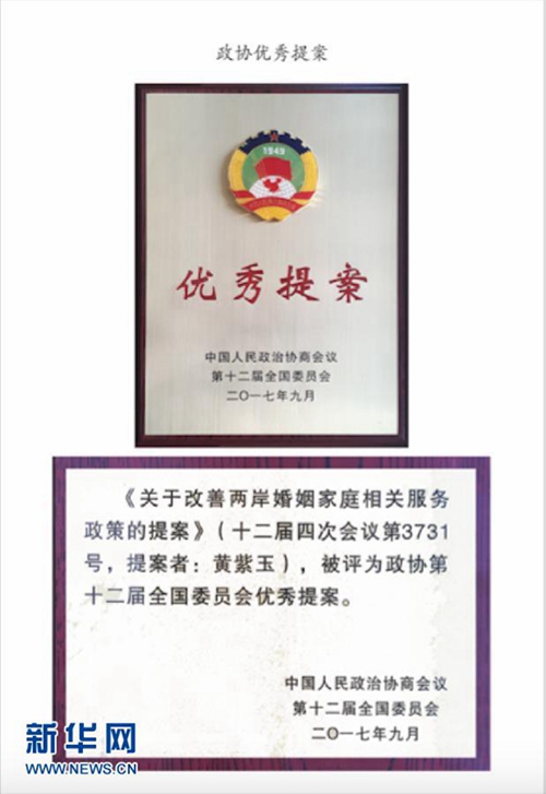 黃紫玉的《關于改善兩岸婚姻家庭相關服務政策的提案》被評為政協(xié)第十二屆全國委員會優(yōu)秀提案(受訪者供圖)。新華社發(fā)