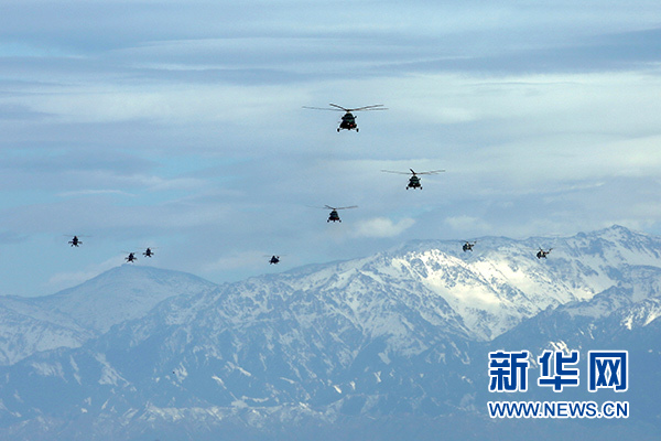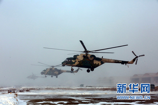 2018年1月5日,新疆軍區(qū)某陸航旅運輸直升機一營在嚴寒條件下組織飛行訓(xùn)練。 新華社發(fā)(吳世科 攝)