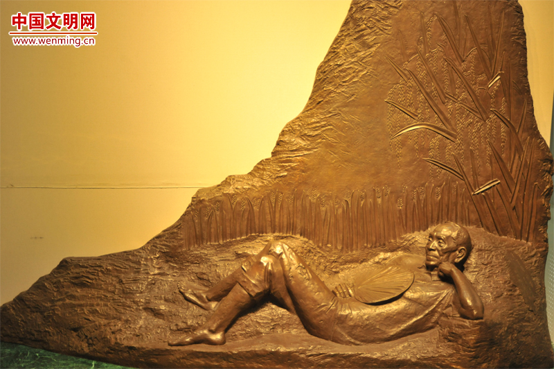 袁隆平“禾下乘涼夢(mèng)”雕塑。他曾夢(mèng)見水稻如高粱一般高,穗子和掃把一樣長(zhǎng),谷粒猶如花生米那樣大,人們可以坐在稻穗之下乘涼。湖南雜交水稻研究中心魏科 攝