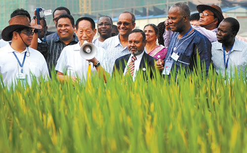 2009年9月,袁隆平帶各國(guó)朋友參觀試驗(yàn)田。新華社發(fā)