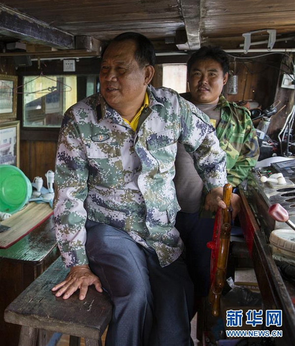 11月14日,在海南省瓊海市潭門(mén)鎮(zhèn),王書(shū)茂(左)在漁船上。 新華社發(fā)(宋國(guó)強(qiáng) 攝)