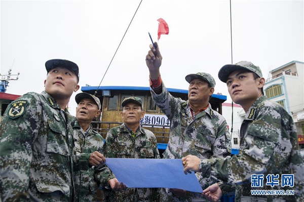 12月10日,在海南省瓊海市潭門(mén)鎮(zhèn),王書(shū)茂(右二)組織民兵開(kāi)展訓(xùn)練。 新華社發(fā)(宋國(guó)強(qiáng) 攝)