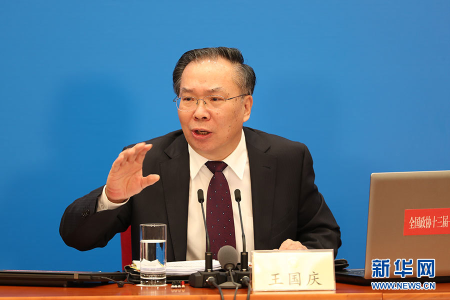 全國政協(xié)十三屆一次會議新聞發(fā)布會3月2日16:30在人民大會堂一層新聞發(fā)布廳召開,大會新聞發(fā)言人王國慶向中外媒體介紹本次大會有關情況并回答記者提問。圖為大會新聞發(fā)言人王國慶回答記者提問。?新華網(wǎng)/中國政府網(wǎng) 陳杰 攝
