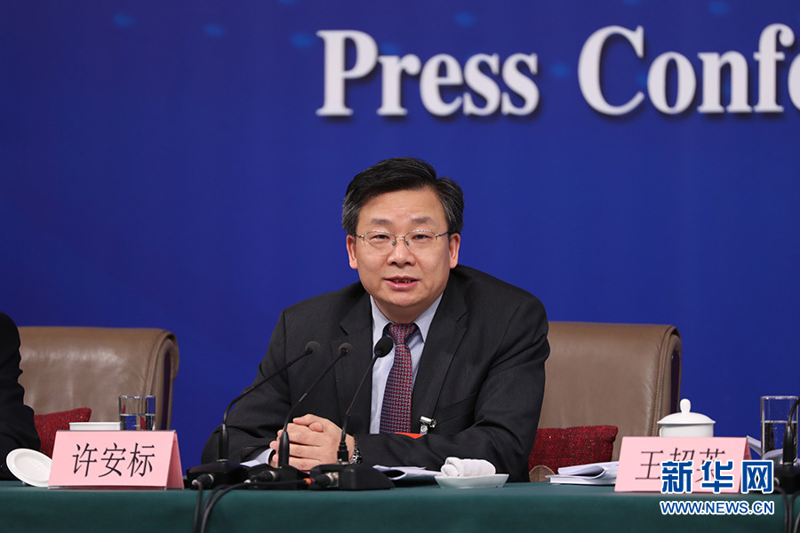 3月12日,十三屆全國人大一次會(huì)議新聞中心在梅地亞中心多功能廳舉行記者會(huì),邀請(qǐng)十二屆全國人大內(nèi)司委副主任委員王勝明、財(cái)經(jīng)委副主任委員烏日?qǐng)D、教科文衛(wèi)委副主任委員吳恒、環(huán)資委委員呂彩霞,全國人大常委會(huì)法工委副主任王超英、副主任許安標(biāo)就“人大立法工作”相關(guān)問題回答中外記者提問。圖為全國人大常委會(huì)法工委副主任許安標(biāo)回答記者提問。新華網(wǎng)/中國政府網(wǎng) 翟子赫 攝