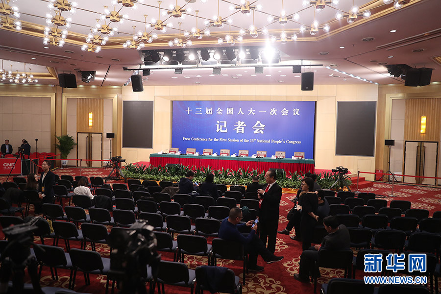 3月12日,十三屆全國人大一次會議新聞中心在梅地亞中心多功能廳舉行記者會,邀請十二屆全國人大內(nèi)司委副主任委員王勝明、財(cái)經(jīng)委副主任委員烏日圖、教科文衛(wèi)委副主任委員吳恒、環(huán)資委委員呂彩霞,全國人大常委會法工委副主任王超英、副主任許安標(biāo)就“人大立法工作”相關(guān)問題回答中外記者提問。圖為記者會開始前。新華網(wǎng)/中國政府網(wǎng) 翟子赫 攝