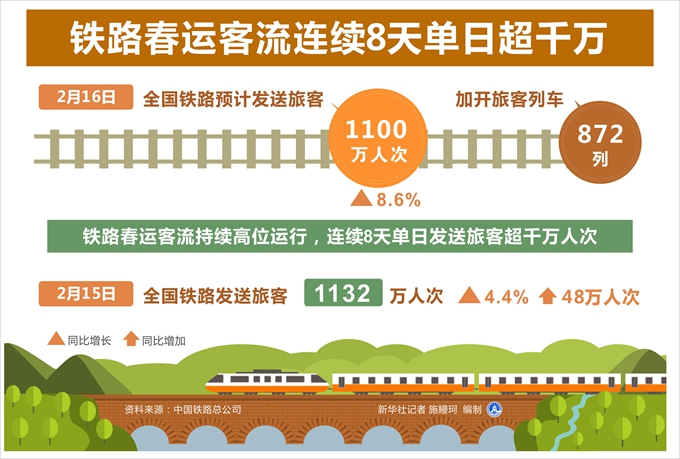 新華社北京2月16日電(記者樊曦、葉昊鳴)記者從中國鐵路總公司獲悉,16日,全國鐵路預計發(fā)送旅客1100萬人次,同比增長8.6%,加開旅客列車872列。鐵路春運客流持續(xù)高位運行,連續(xù)8天單日發(fā)送旅客超千萬人次。