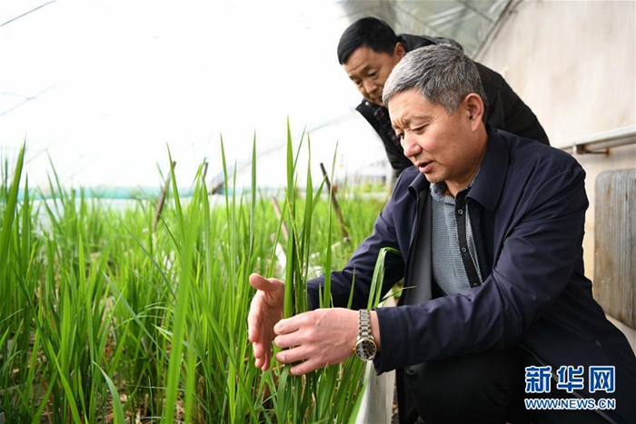 孫斌(前)在黑龍江省樺南縣水稻分子育種研發(fā)中心溫室大棚查看育種水稻長(zhǎng)勢(shì)(2月2日攝)。新華社記者 王建威 攝