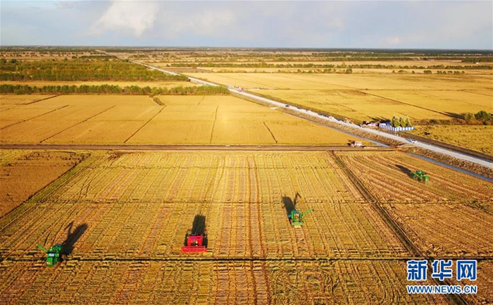 大型農(nóng)機(jī)在黑龍江省三江平原上收割水稻(2017年9月28日無(wú)人機(jī)拍攝)。新華社記者 王建威 攝