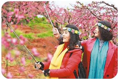 游客在江西省贛州市龍南縣桃花園自拍。劉 青攝(人民圖片)
