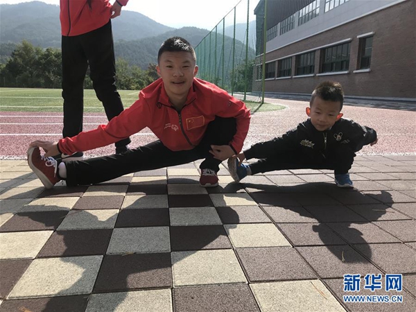 圖為李想(左)與弟弟一起做拉伸。(李想的母親楊建英提供的資料照片) 新華社發(fā)