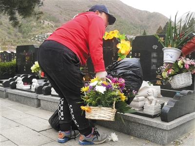 然而記者在園中發(fā)現(xiàn)了奇怪的身影。在一處偏僻的角落里,一名騎三輪車的男子一直默默觀望著。待祭掃者離開后,他騎車來(lái)到墓前,迅速收走剛擺上的花束,隨后匆匆離去。