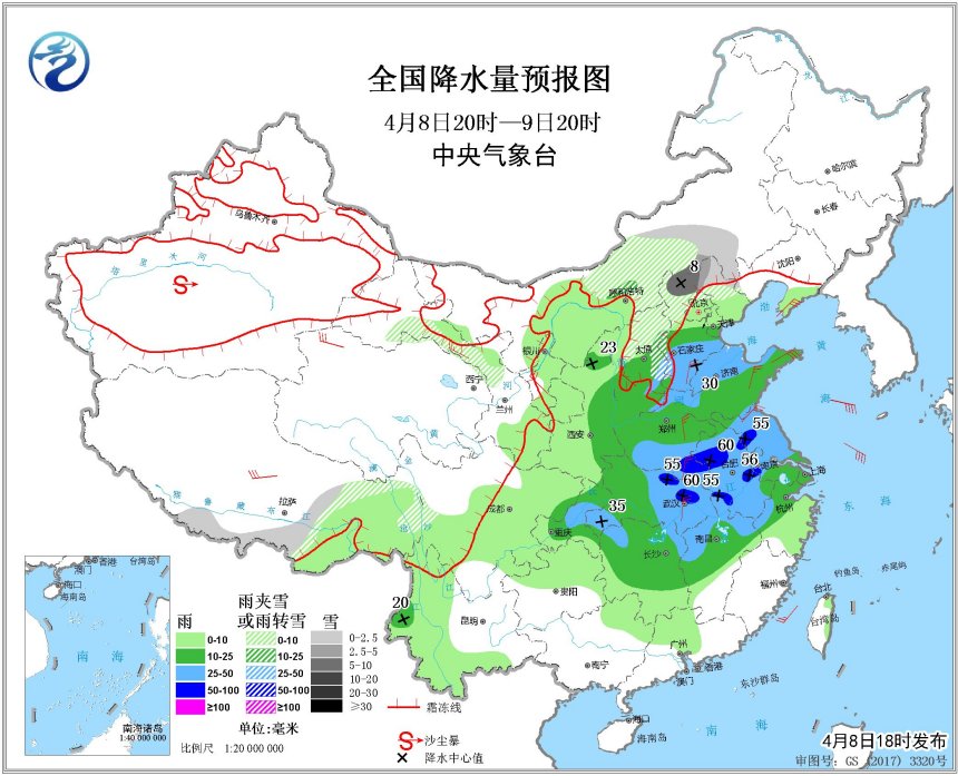 張濤:降水的主要影響時間為8日夜間到9日白天。北方地區(qū)以大范圍小到中雨的穩(wěn)定性降水為主,無雷電,影響區(qū)域主要集中在西北地區(qū)東部、內(nèi)蒙古中部、華北、黃淮等地。河北南部、河南北部、山東西部等地會達到大雨量級。除此之外,北方部分地區(qū)降水會經(jīng)過雨轉(zhuǎn)雨夾雪或雪的過程,轉(zhuǎn)化主要位置在山西北部、河南北部、北京北部等,內(nèi)蒙古中部局部地區(qū)會出現(xiàn)大雪天氣。南方的降水量相對較大,以中到大雨為主,部分地區(qū)有暴雨,江漢、黃淮南部、江淮、江南等區(qū)域會伴有雷電。河南南部和西部、安徽中北部、江蘇中北部和南部、湖北北部和南部、湖南西部等地的部分地區(qū)將有短時強降水天氣;河南南部、安徽中北部、湖北北部和東部等地的局地將有雷暴大風或冰雹天氣。