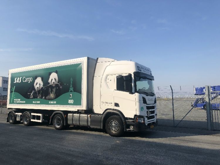 4月4日,在丹麥?zhǔn)锥几绫竟膭P斯楚普國際機(jī)場,一輛印有歡迎“星二”和“毛筍”(“毛二”的乳名)來哥本哈根字樣的集裝箱卡車等待運送大熊貓。(新華社發(fā) 何李杰攝)