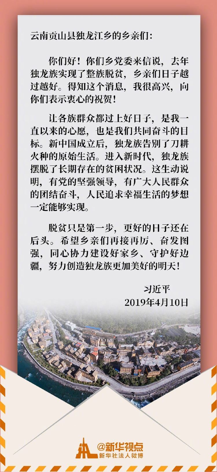 這一天,習(xí)近平總書記給他們回信。總書記在信中祝賀獨(dú)龍族實(shí)現(xiàn)整族脫貧,勉勵(lì)鄉(xiāng)親們?yōu)檫^(guò)上更加幸福美好的生活繼續(xù)團(tuán)結(jié)奮斗。