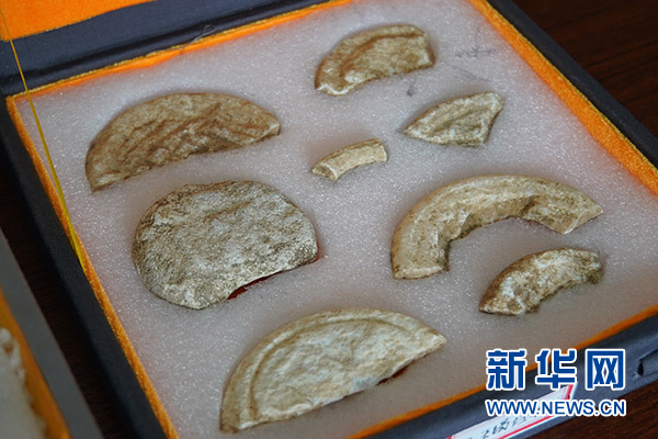 4月29日,考古學(xué)家研究討論黃山遺址新出土的玉鉞。 新華社記者 袁月明 攝
