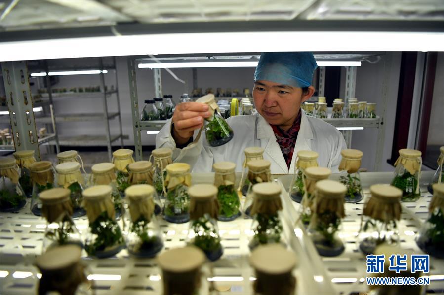 工作人員在洛陽國家牡丹園組織培養(yǎng)室中觀察牡丹組織培養(yǎng)苗生長情況(4月24日攝)。新華社記者 李嘉南 攝