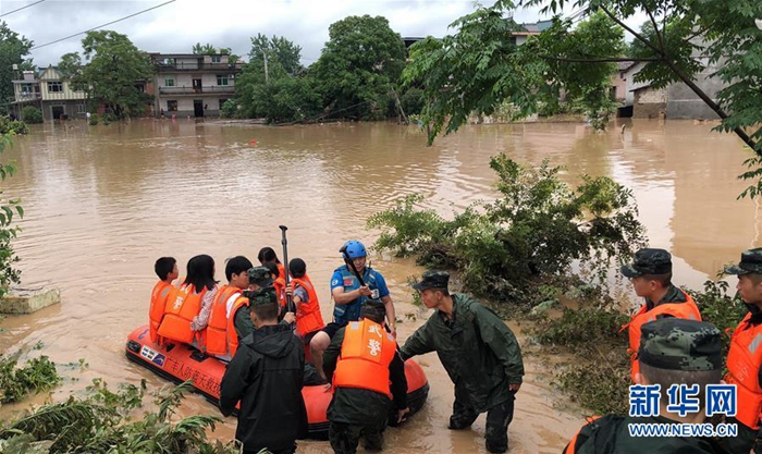 6月7日,武警江西省總隊上饒支隊官兵在玉山縣六都鄉(xiāng)六都村轉(zhuǎn)移被洪水圍困的群眾。新華社發(fā)(吳展 攝)