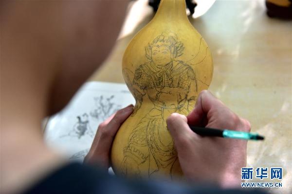 午后陽光和煦,聽障生創(chuàng)新創(chuàng)業(yè)工作室里,來自貴州的徐崇瑞手持鉛筆,在一個(gè)嶄新的葫蘆上勾勒年畫,筆法細(xì)膩,有條不紊。身后的書架上整齊擺放著他們制作的葫蘆烙畫、手工皮包、糧食鑲嵌畫等作品。
