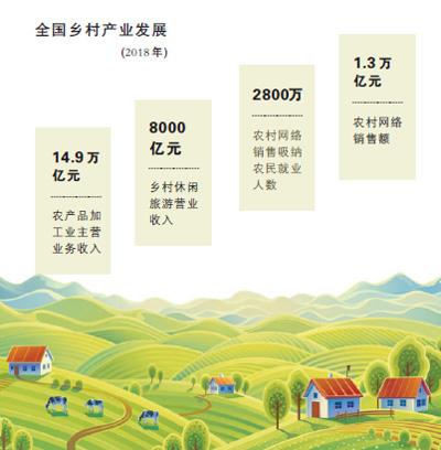 產(chǎn)業(yè)興旺是鄉(xiāng)村振興的基礎(chǔ),是解決農(nóng)村問題的前提。黨的十八大以來,鄉(xiāng)村產(chǎn)業(yè)呈現(xiàn)良好發(fā)展勢頭。2018年,糧食產(chǎn)能連續(xù)7年保持在1.2萬億斤以上,農(nóng)產(chǎn)品加工業(yè)主營業(yè)務(wù)收入達(dá)14.9萬億元,鄉(xiāng)村休閑旅游營業(yè)收入超過8000億元,農(nóng)業(yè)生產(chǎn)性服務(wù)業(yè)營業(yè)收入超過2000億元,農(nóng)村網(wǎng)絡(luò)銷售額1.3萬億元,返鄉(xiāng)下鄉(xiāng)創(chuàng)新創(chuàng)業(yè)人員累計達(dá)780萬。