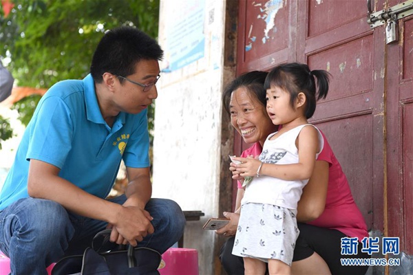 楊杰興(左)在廣西樂(lè)業(yè)縣百坭村向村民了解孩子讀幼兒園的情況(8月1日攝)。新華社記者 周華 攝