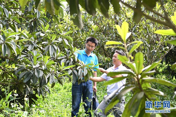 楊杰興(左)在廣西樂(lè)業(yè)縣百坭村實(shí)地了解村里枇杷產(chǎn)業(yè)發(fā)展情況(8月1日攝)。新華社記者 周華 攝