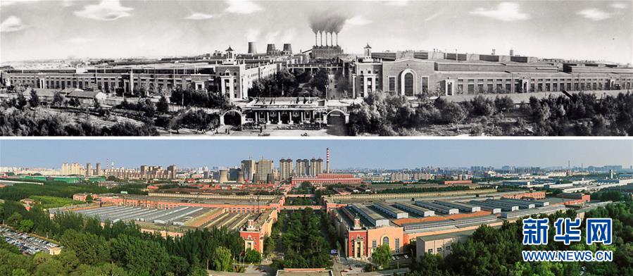 拼版照片:上圖為20世紀(jì)50年代的第一汽車制造廠廠區(qū)(資料圖片);下圖為2019年6月12日無(wú)人機(jī)拍攝的一汽廠區(qū)全景(新華社記者 許暢 攝)。新華社發(fā)