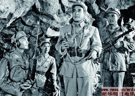 國產(chǎn)故事片《上甘嶺》鏡頭之一:堅守在上甘嶺的英雄們——張連長(右二)、通訊員楊德才(右一)、衛(wèi)生員王蘭(左二)。新華社發(fā)