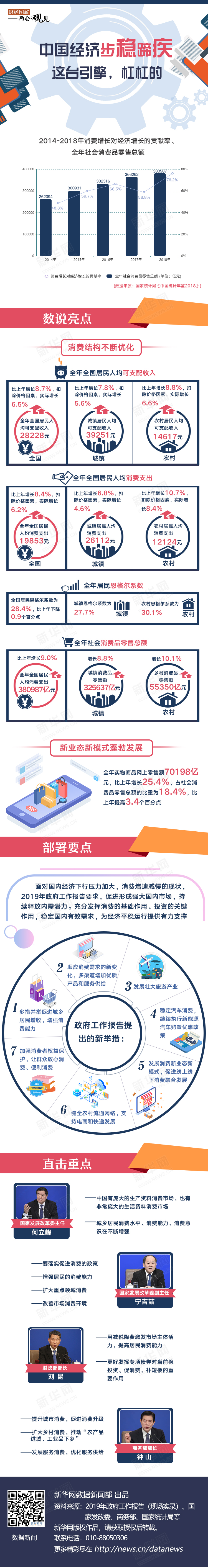 新華網(wǎng)北京3月9日電(劉緒堯 何凡) 2018年消費的增長對經(jīng)濟增長的貢獻達到76.2%,已連續(xù)五年成為拉動經(jīng)濟增長的主引擎,消費結(jié)構(gòu)不斷優(yōu)化,教育、文化、娛樂、醫(yī)療保健等服務(wù)消費支出比例穩(wěn)步提高。當(dāng)前,我國整個國民經(jīng)濟13.6萬億美元的總量當(dāng)中,消費總量已超過8萬億美元。未來如何更充分地發(fā)揮消費的基礎(chǔ)作用?且看政府工作報告如何部署。