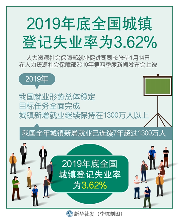 新華社北京1月14日電(記者王優(yōu)玲)人力資源社會(huì)保障部就業(yè)促進(jìn)司司長(zhǎng)張瑩14日說(shuō),2019年我國(guó)就業(yè)形勢(shì)總體穩(wěn)定,目標(biāo)任務(wù)全面完成,城鎮(zhèn)新增就業(yè)繼續(xù)保持在1300萬(wàn)人以上,2019年底全國(guó)城鎮(zhèn)登記失業(yè)率為3.62%。