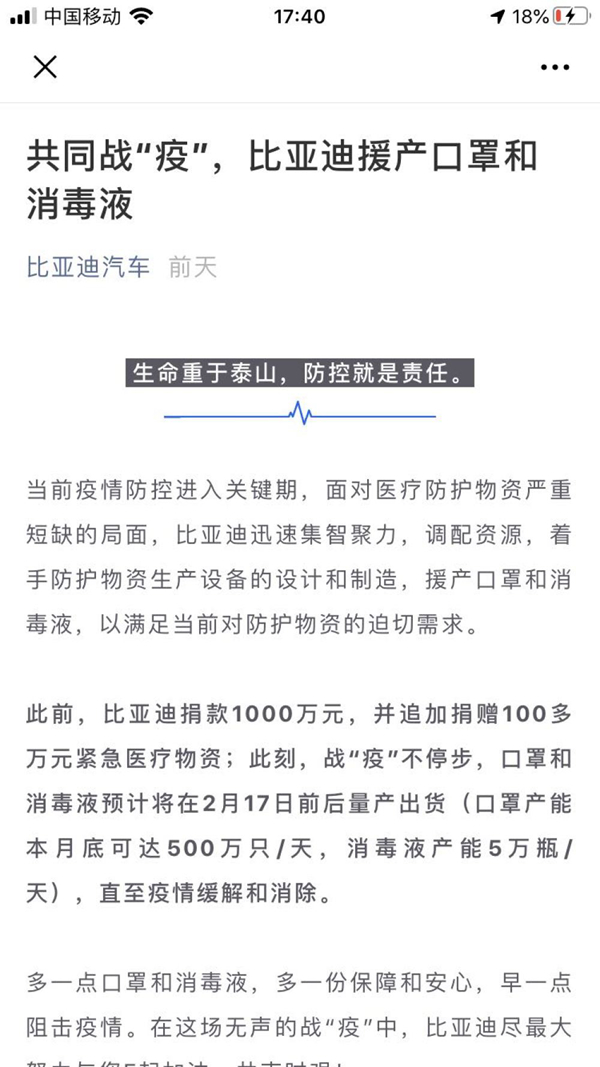2月8日,“比亞迪汽車”微信號一篇《共同戰(zhàn)“疫”,比亞迪援產(chǎn)口罩和消毒液》引發(fā)網(wǎng)友關(guān)注,文章稱,比亞迪將在2月17日前后預計量產(chǎn)出貨口罩和消毒液(口罩產(chǎn)能本月底可達500萬只/天,消毒液產(chǎn)能5萬瓶/天),直至疫情緩解和消除。