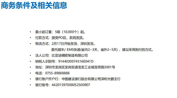與此同時,《比亞迪賣口罩了》pdf文件也在網(wǎng)上流傳,文件內(nèi)容顯示,口罩制造的法人公司為比亞迪精密制造有限公司,最小起訂量為5箱(10000個)起,2月17日開始從深圳發(fā)貨??爝f委托順豐/ EMS快遞(省內(nèi)2-3天,省外2-5天) 。