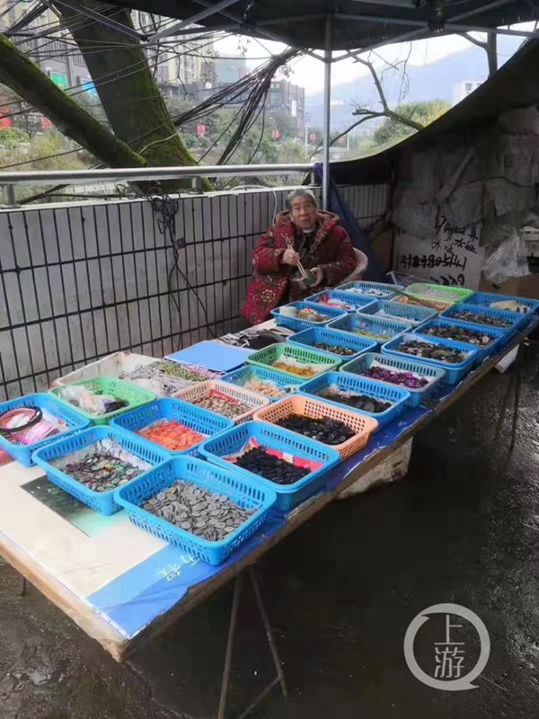 倪素英老人原本在萬新農(nóng)貿(mào)市場門口擺攤,賣紐扣、針線、鞋墊一類的百貨用品。