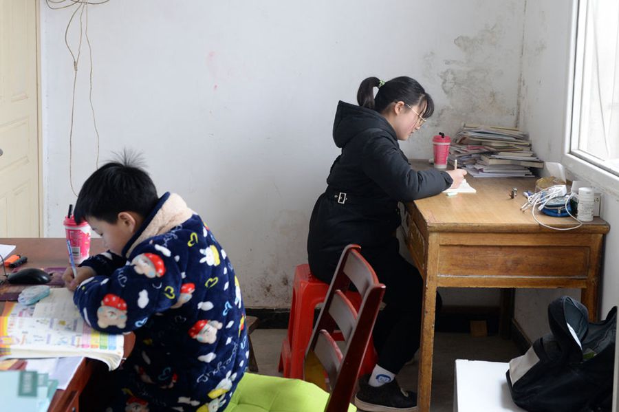 崔愛(ài)國(guó)和周超群的兩個(gè)孩子在衛(wèi)生室已消毒的隔間內(nèi)學(xué)習(xí)。(新華社記者黃博涵 攝)