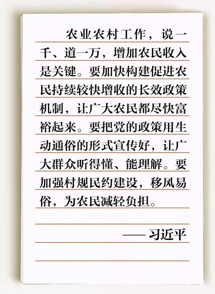 “致富路越走越寬,日子越過越紅火,全靠黨的政策好??倳浉吲d地說,農(nóng)業(yè)農(nóng)村工作,說一千、道一萬,增加農(nóng)民收入是關(guān)鍵?!?/font>
